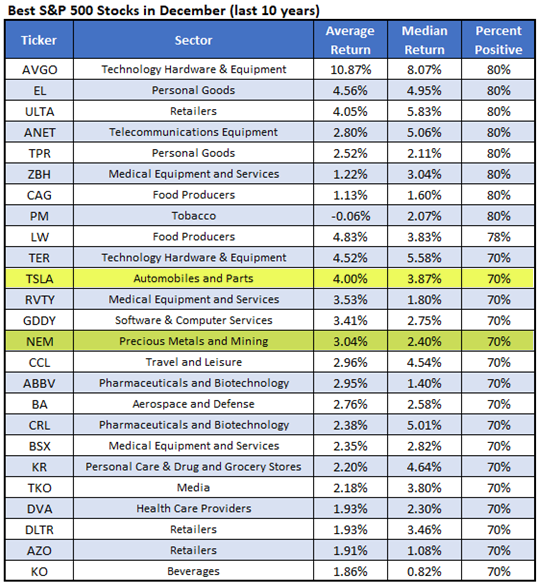 Even after the October scaries, the shares stayed within the uptrend channel, and are now entering a historically bullish month. NEM averages a 3% return in December in the last decade to go with a 70% win rate, the only mining stock on the list.